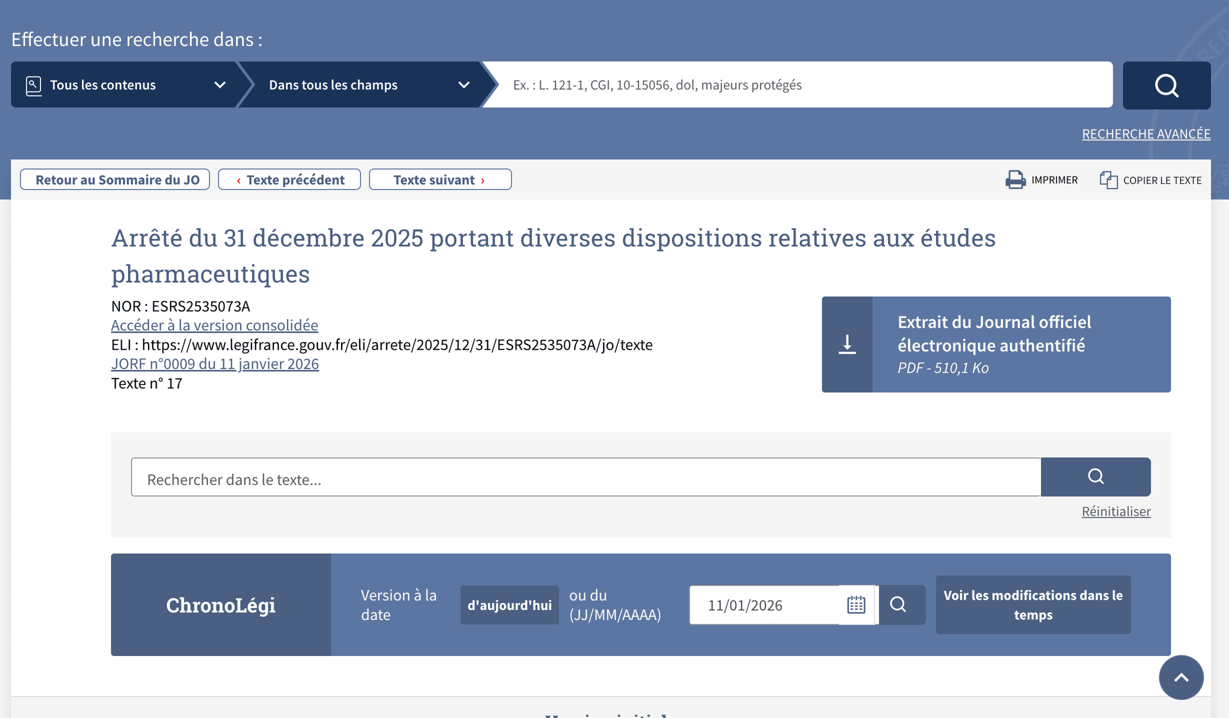 Un arrêté publié au Journal officiel le 11 décembre 2025 précise les nouvelles règles du 3ᵉ cycle des études de pharmacie, notamment pour les étudiants en filiaire officine. Deux mesures principales redéfinissent la formation sur le terrain.